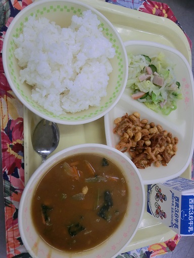 きょうの給食☆ スピナッチカレー 大豆とれんこんのカリカリ揚げ ハムと大根のサラダ 牛乳