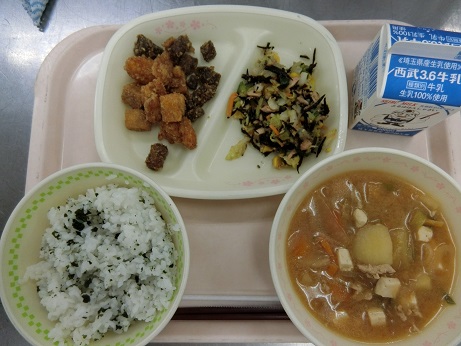 混ぜ込みわかめごはん・鶏肉と高野豆腐のごまだれ・ツナとひじきのサラダ・スタミナスープ・