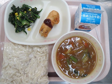 きょうの献立は カレーうどん・アメリカンドッグ・和風ほうれん草サラダ・ 牛乳です。 エネルギー 865 kcal たんぱく質 29.5g 脂 質 27.0g 食塩相当量 4.4g