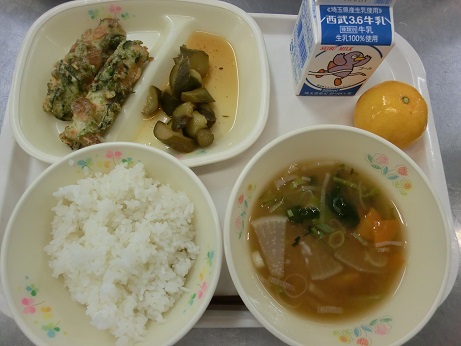 きょうは、 ごはん・牛乳・ちくわのカラフル揚げ・すいとん きゅうりのピリッと漬け・冷凍みかんでした。 きょうから2学期の給食が始まりました。今学期もよろしく お願いいたします。 きょうは、「防災の日」です。 長期可能な乾物を使用して、簡単にできて空腹が満たされ る料理ということで「すいとん」を作りました。 「備えあれば憂いなし」ご家庭でも食糧や水などをいざと いう時にある程度準備しておくといいですね。