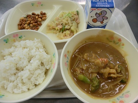 冬野菜のカレー・牛乳・大豆のカリカリ揚げ・ハム