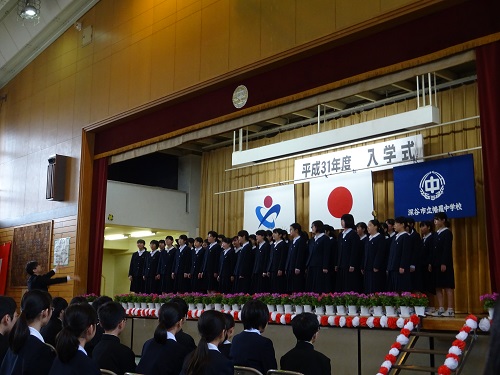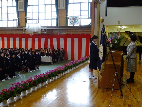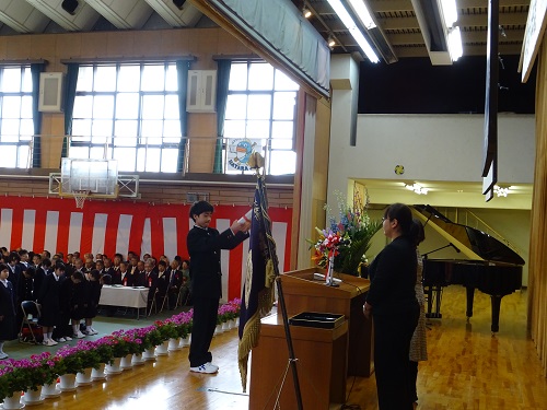 本日、入学式が行われ、新入生全員が参加することができました。 式の前半では、音楽部の美しい歌声による校歌紹介が行われました。 新入生呼名も、全員が大きな声での返事、起立から礼、着席までしっかりとした態度でできました。 代表生徒による教科書授与や新入生誓いの言葉も、素晴らしい態度でした。