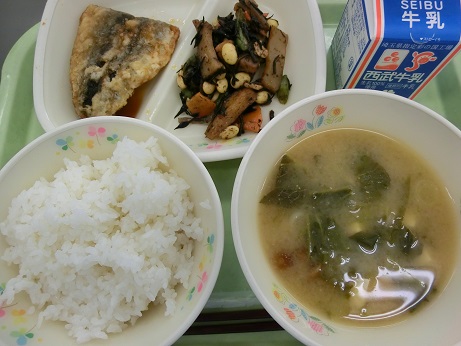 きょうは、 ごはん・牛乳・さんまの蒲焼き・大豆の磯煮 なめこ汁でした。 さんまは、たんぱく質、脂肪、骨や歯をつくるビタミンD が多く、脳の働きをよくするDHAや血栓予防に役立つ EPAも含んでいます。 |