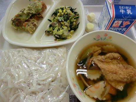 きょうは、 きつねうどん・牛乳・ちくわの磯辺揚げ・ほうれん草 とコーンのソテー・チーズでした。 じっくりと甘辛く煮た油あげを、うどんの汁の中に入れて 食べる料理です。 4月から摂取基準が一部改訂してカルシウムの摂取基準が 上がりました。きょうは、チーズを添えて補いました。