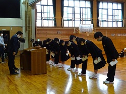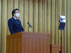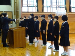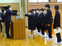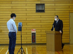 21日に学級委員の任命式が行われました。感染症対策としてTeamsによるリモート形式で行い、学級委員のみが体育館で認証を受け、ほかの生徒は教室で視聴しました。