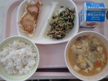 きょうの献立は 発芽玄米入りごはん・鶏肉のみそチーズ焼き・ツナとひじきのサラダ・