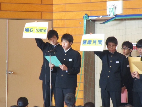式の後、保健委員から「come噛む(かむかむ)健康月間」の取り組みについて説明がありました。