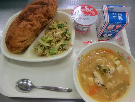 ココア揚げパン・牛乳・肉団子のキムチスープ