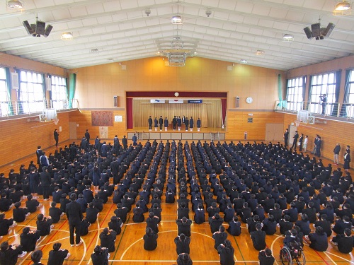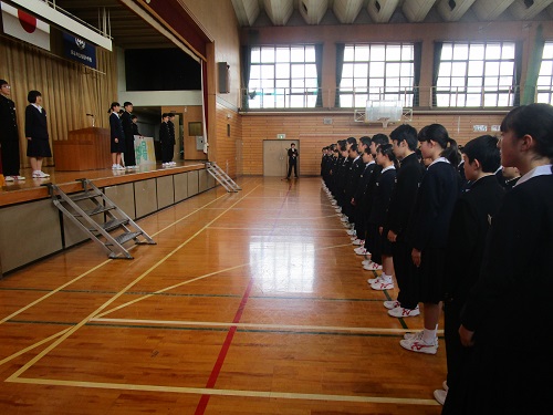朝会に先立って、生徒会本部役員と、各学年の挨拶リーダーを中心に挨拶運動が行われ、当面の生活についての呼びかけに続いて、各学年そして全校生徒による、挨拶が大きな声で体育館に響きました。