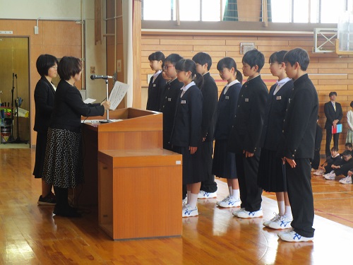 本日、全校朝会で学級委員の任命が行われました。 各クラス、学年でリーダーとして活躍することを期待しています。