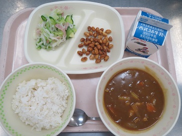 きょうの献立は カレーライス・大豆のカリカリ揚げ・ハムと大根のサラダ・ 牛乳です。 エネルギー 875 kcal たんぱく質 25.8g 脂 質 31.5g 食塩相当量 3.2g