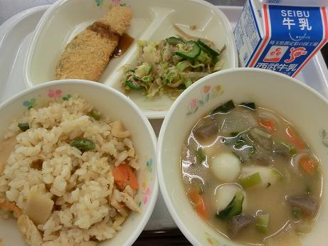 きょうは、 たけのこごはん・牛乳・鮭フライ・ヘルシーサラダ だんご汁でした。 旬の「たけのこごはん」がおいしくできました。ごはんの残りが 全体で1kgで本当によく食べていました。季節の食材をできる だけたくさん味わってもらいたいと思います。 |