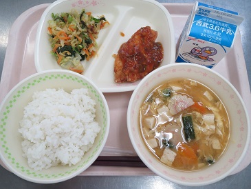 きょうの献立は ごはん・鶏肉の甘酢あんかけ・おかかあえ・かき玉みそ汁・ 牛乳です。 エネルギー 831 kcal たんぱく質 36.9 g 脂 質 25.0 g 食塩相当量 3.0 g