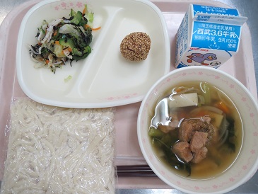 沖縄風ソーキそば・紅芋ごま団子・ひじきサラダ・牛乳