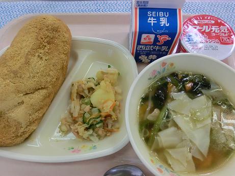 きなこ揚げパン・牛乳・ワンタンスープ・ツナと野菜