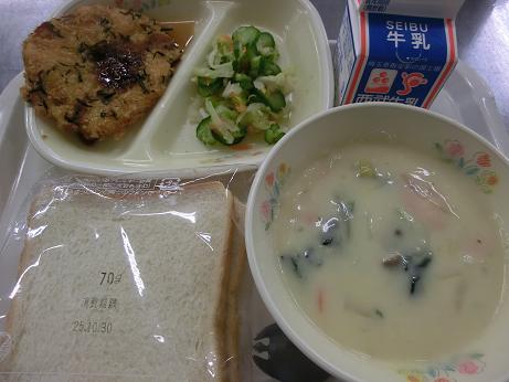 きょうは、 ハムカツサンド・牛乳・秋の味覚シチュー・きゃべつと きゅうりのドレッシングでした。 秋の味覚シチューには、しめじやさつまいもが入っています。 さつまいもには、ビタミンCが多く含まれています。また、 さつまいもを切ると出てくる白い液にはヤラピンという成分が 含まれ、大腸ガン予防にも役立ちます。 |