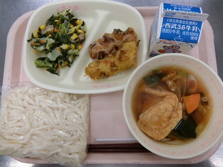 きつねうどん・竹輪の2色揚げ・ほうれん草とコーンのソテー・牛乳