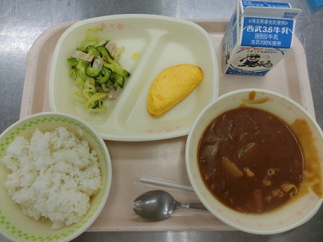 チキンカレーライス・オムレツ・ハムと大根のサラダ・牛乳
