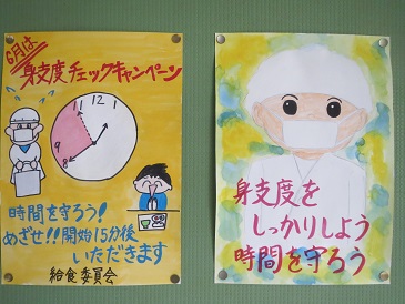 給食委員会では 衛生強化月間の取り組みとして、身支度チェック・時間を守ろう