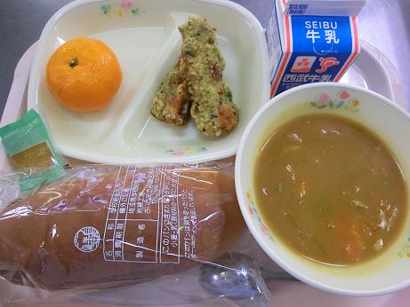 きょうは、コッペパン・りんごジャム・カレーシチュー・ちくわの