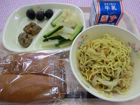 黒パン・牛乳・ひじき入りつくね・海鮮塩焼きそば・