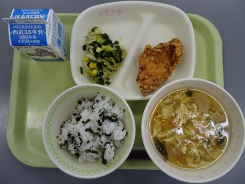 きょうの献立は わかめごはん・鶏の唐揚げ・ほうれん草ソテー・かき玉汁・ 牛乳です。 エネルギー 788 kcal たんぱく質 38.2g 脂 質 22.4g 食塩相当量 3.4g