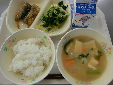ごはん・牛乳・さんまの蒲焼き・おひたし・野菜椀