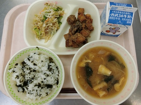 きょうの献立は わかめごはん・豚肉と高野豆腐のごまだれ・切干大根のサラダ・ みそ汁・牛乳です。