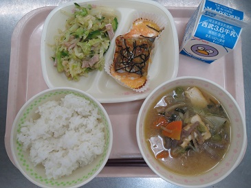 きょうの献立は ごはん・鰆の明太マヨ焼き・たくあんサラダ・豚汁・牛乳です。 エネルギー 835 kcal たんぱく質 37.6g 脂 質 28.3g 食塩相当量 3.2g