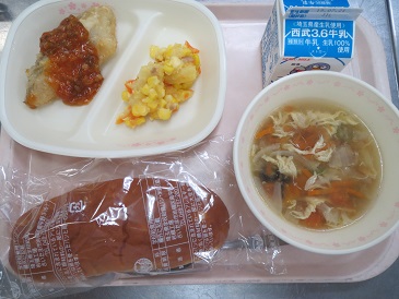 きょうの献立は パインパン・白身魚の甘酢あんかけ・コーンとじゃがいもの炒め物・ 夏風スープ・牛乳です。
