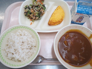 きょうの献立は ハヤシライス・オムレツ・ツナとひじきのサラダ・牛乳です。