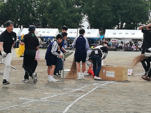 10月6日幡羅地区市民体育祭が東方公園で開催されました。 本校の1年生が運営ボランティアとして、用具の運搬などを手伝う仕事をがんばっていました。