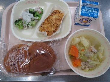 きょうの献立は はちみつパン・チキンフレーク焼き・ブロッコリーサラダ・ ポトフ・牛乳です。 エネルギー 849 kcal たんぱく質 41.1 g 脂 質 28.0 g 食塩相当量 3.6 g