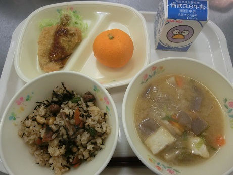 ひじきご飯・牛乳・あじフライ・せんきゃべつ・豚汁