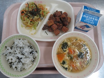 わかめごはん・豚肉と高野豆腐のごまだれ・磯の香あえ・