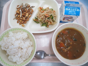 小江戸カレーライス・大豆のカリカリ揚げ・切り干し大根の和え物・