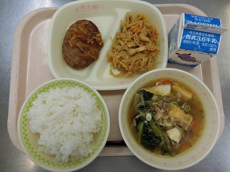 きょうの献立は ごはん・和風おろしハンバーグ・切り干し大根の炒り煮・豚汁・牛乳です。