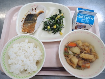 きょうの献立は ごはん・肉じゃが・鯖のねぎみそ焼き・和風ほうれん草サラダ・ 牛乳です。 エネルギー 843 kcal たんぱく質 35.0 g 脂 質 23.9 g 食塩相当量 2.9 g