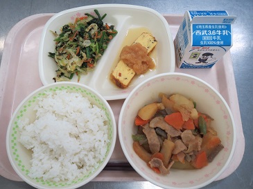 ごはん・肉じゃが・厚焼き卵 おろし添え・磯の香あえ・牛乳