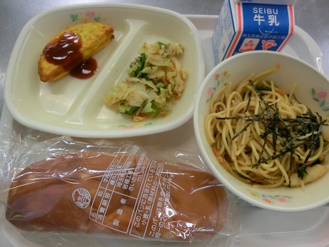 きょうは、 パインパン・牛乳・オムレツ・和風スパゲッティ 春キャベツのサラダでした。 和風スパゲッティは、イカやしめじが入った醤油味の スパゲッティです。 |