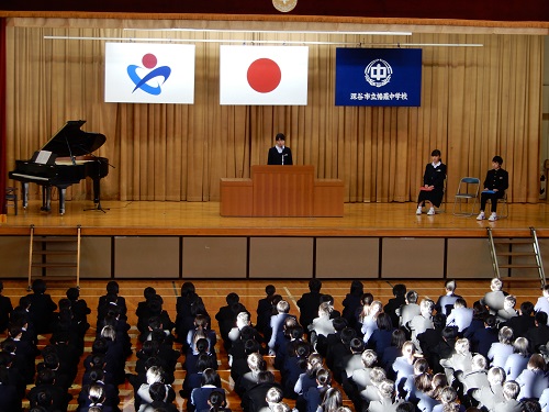 1月8日(火) 3学期始業式が厳粛に行われました。 各学年の代表(1年島田さん、2年矢澤さん、3年中邨君)から立派な新年の抱負が発表されました。 校長先生からは、平成31年の新たな年のはじめに、夢や志を立て生活しよう。人口減少に伴い複雑で予測困難な時代が到来する。1人ではなく、チームで「答えのない課題」に最善策を導くことができる能力が今、求められている。社会全体で改めて「チーム力」が大切であると見直されている。これからも「時・場・礼」や「文武両道」を実践して非認知能力(自制心、自己効力感、勤勉性、やり抜く力)を高めよう。という話がありました。全校生徒はワークシートを片手に、真剣に耳を傾けていました。幡羅中のすばらしい誇れるところです。 また、本日は塚越先生の代替として新たに英語を担当する田中ふみ先生の紹介もありました。 保護者、地域の皆さん、3学期も幡羅中をよろしくお願いします。