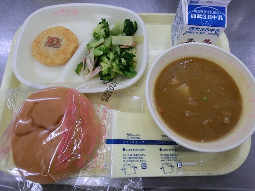 きょうの給食☆ 子供パンスライス スライスチーズ 深谷市20周年記念コロッケ カレーシチュー ブロッコリーサラダ 牛乳