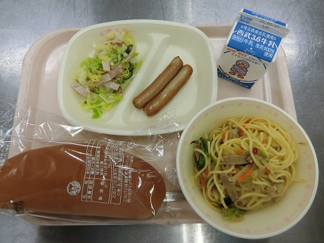 黒パン・春キャベツとあさりのスパゲティ・焼きウインナー・ハムのマリネ・牛乳