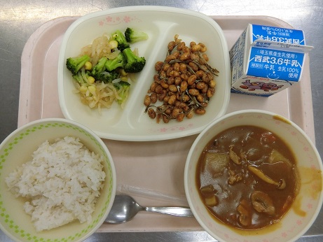 きょうの献立は 森のきのこカレー・大豆のカリカリ揚げ・温野菜・牛乳です。
