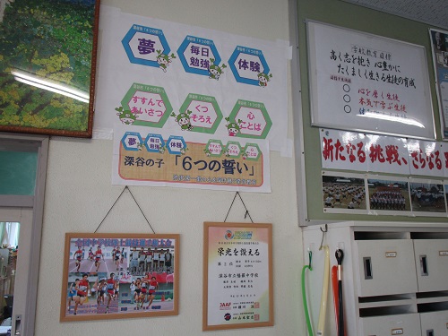 朝会に先立って、挨拶リーダーによる挨拶運動が行われました。  本校の来客者・職員玄関には、「深谷の子『6つの誓い』」が掲示されています。 |