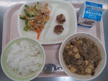 ごはん・マーボーなす豆腐・しゅうまい・春雨サラダ・牛乳