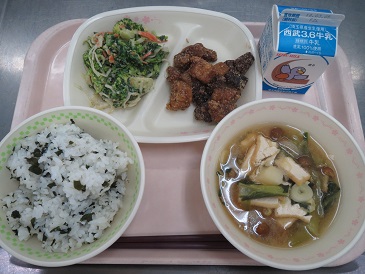 わかめごはん・豚肉と高野豆腐のごまだれ・冬野菜のごまマヨあえ・