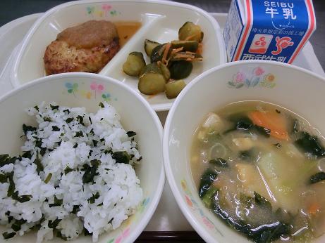 きょうは、 わかめごはん・牛乳・和風おろしハンバーグ・ きゅうりのピリッと漬け・みそ汁です。 わかめごはんは、生徒に大人気です。きょうも残りが全く ありませんでした。