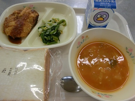 ハムカツサンド・牛乳・ミネストローネ・ほうれん草と