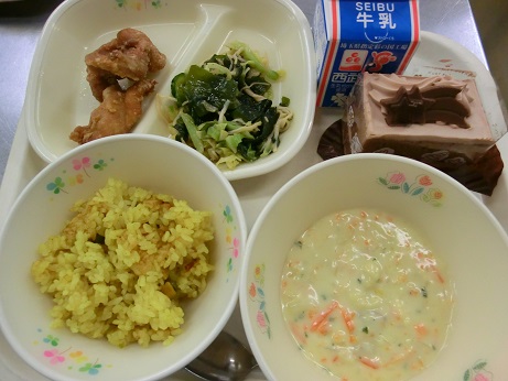 きょうは、 カレーピラフドリア風・牛乳・唐揚げ・和風サラダ セレクトデザートでした。 きょうで2学期の給食が終了しました。最終日はクリスマス メニューです。セレクトデザートは3種類のケーキやゼリー から一つ選んでもらいました。今学期も給食にご協力いただき ありがとうございました。 3学期の給食は、1月9日から開始します。